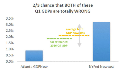 There is a 2/3 chance that both competing Federal Reserve 2017 Q1 GDP nowcasts are wrong! That’s an audacious prediction for the storied NY and Atlanta institutions (one of them led by my former big boss Timothy Geithner), and yet there is no way around the current confusion they are in. This is also critically important as one is showing a robust 3.2% growth reading, while the other is at 0.9% (the 2nd lowest reading in nearly 3-years) and essentially indicates that we are descending towards recession.