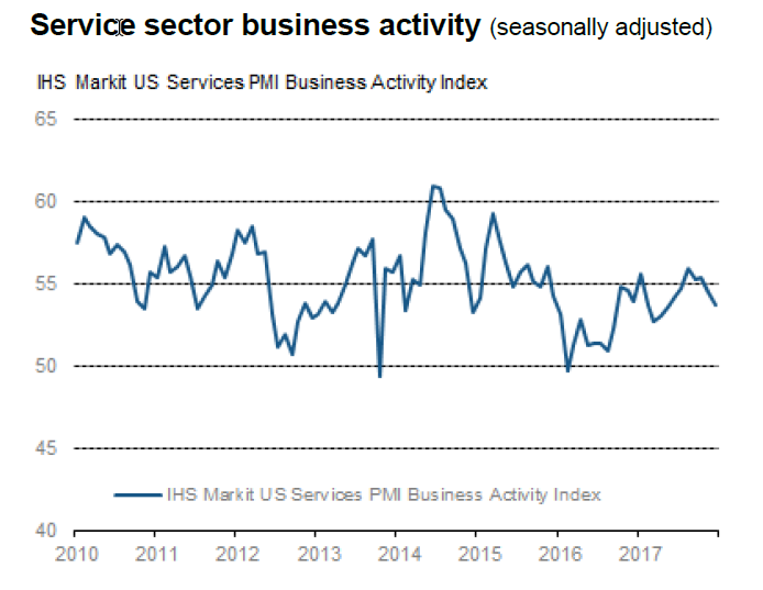 - “A note of caution is sounded by a deterioration in optimism about the outlook in the service sector to the joint-weakest in the past 18 months. However, hopefully news of tax cuts and fiscal stimulus in 2018 will help revive business spirits and drive growth higher.”