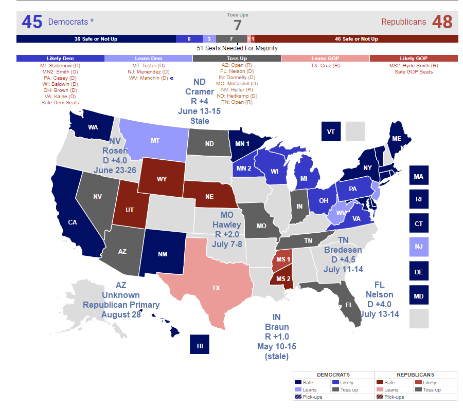 The math is not as daunting as it looks. Democrats are leading in Florida, Tennessee, and Nevada. I expect those leads to hold. That Republicans were only up by 1 percentage point in Indiana looks problematic for Republicans to say the least. For the sake of argument, put that in the Democrat column.