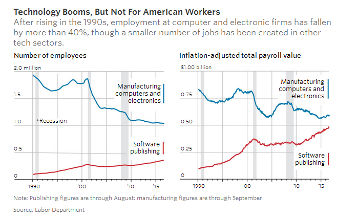 American tech workers are getting a smaller piece of the economic pie created from what they produce. As of 2014, employee compensation in computer and electronic-parts making was equal to 49% of the value of the industry’s output, down from 79% in 1999, according to the Commerce Department.