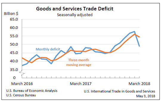 The Census Bureau’s report on International Trade in Goods and Services for March shows a steep, but expected drop in the trade deficit.