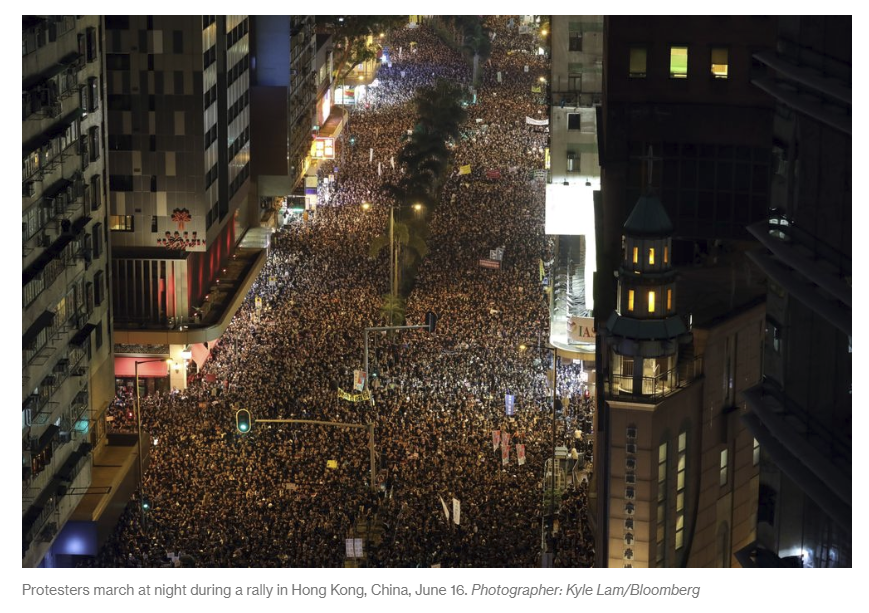 Hong Kong rose up in defiance, jamming the streets with as many as 2 million people to demand leader Carrie Lam’s resignation a day after she suspended a contentious extradition bill. Anger spilled over at a proposed law protesters say threatens the island’s tenuous autonomy from a more authoritarian China.