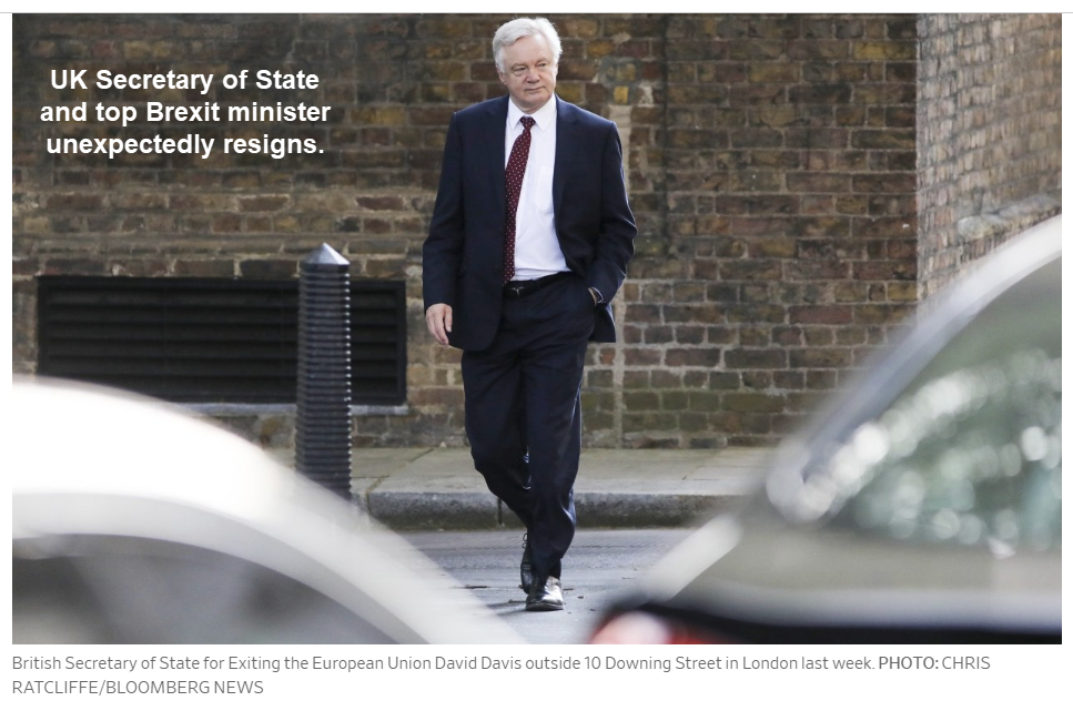 The Wall Street Journal reports David Davis, U.K. Minister in Charge of Brexit Negotiations, Resigns.