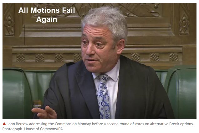Once again, All Options Failed. Even if one of the options succeeds in the next round of indicative votes Theresa May might not go along with it.