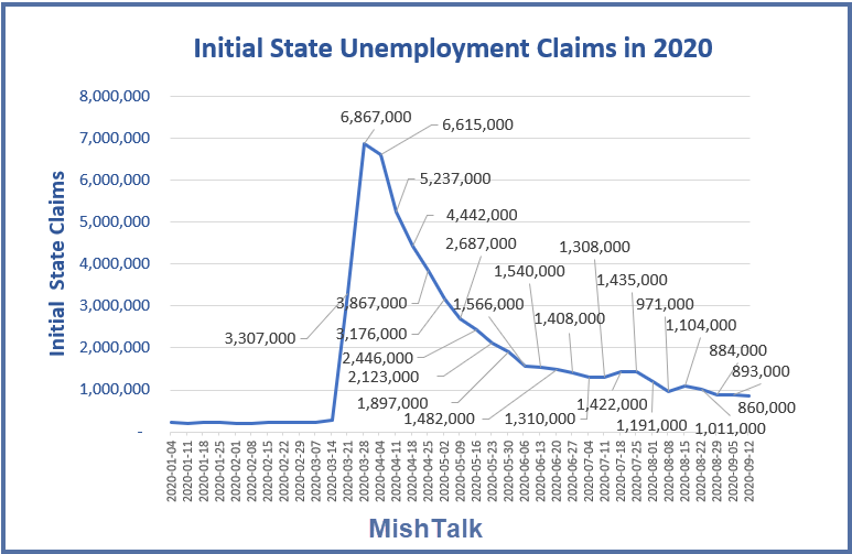 For August 29, September 5, and September 12, there were 884,000, 893,000, and 860,000 seasonally-adjusted claims respectively according to the Department of Labor.