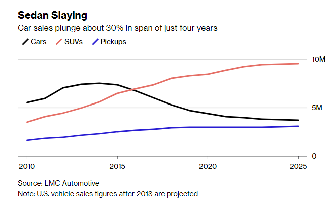 Sales of the passenger-car body style that’s dominated the industry since the Model T will sink to 21.5 percent of the U.S. market by 2025, according to researchers at LMC Automotive, relegating sedans to fringe products. That leaves automakers with excess factory capacity that can turn out about 3 million more vehicles than buyers want. And overcapacity is precisely what spurred losses the last time a recession wracked the industry.
