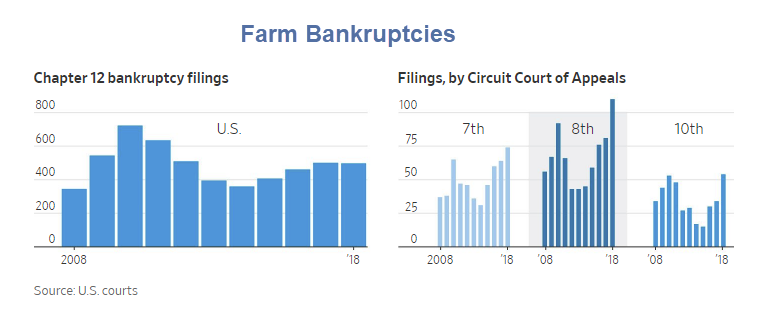 Bankruptcies in three regions covering major farm states last year rose to the highest level in at least 10 years. The Seventh Circuit Court of Appeals, which includes Illinois, Indiana and Wisconsin, had double the bankruptcies in 2018 compared with 2008. In the Eighth Circuit, which includes states from North Dakota to Arkansas, bankruptcies swelled 96%. The 10th Circuit, which covers Kansas and other states, last year had 59% more bankruptcies than a decade earlier.