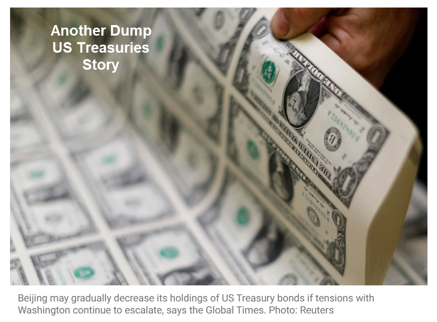 - Here we go again. I am not sure how credible a source Global Times is, but for Beijing selling US Treasuries isn’t the hard part. The hard part is what the PBoC does with the proceeds. If they buy other USD assets, then nothing has changed.