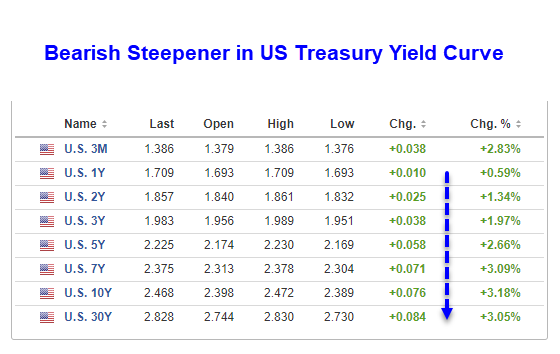 A bearish steepener is generally a sign that market participants believe the economy is getting stronger and the Fed (Central Bank), will be hiking rates faster than previously anticipated or more than anticipated.