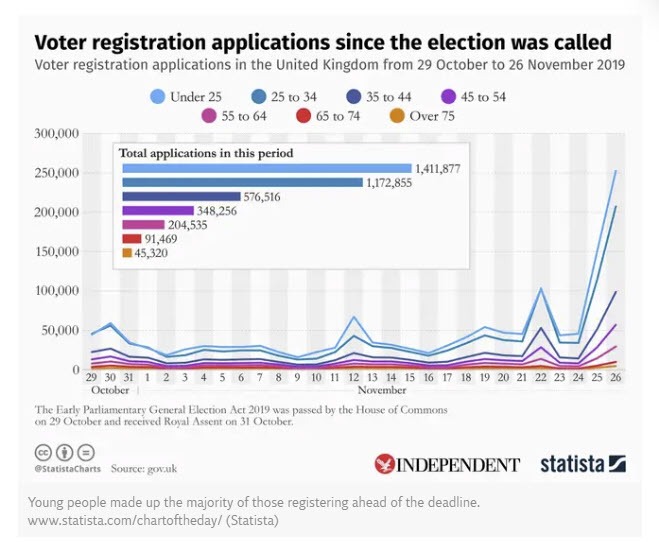 But that may be changing. According to official figures, 3.85 million people registered to vote between the day the election was called on Oct. 29 and Tuesday’s registration deadline — two-thirds of them under 35. The number of new registrations is almost a third higher than in 2017.