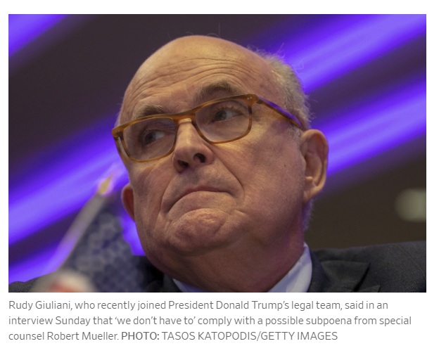 The Wall Street Journal reports Giuliani Says Trump Doesn’t Have to Comply With Mueller Subpoena, Could Invoke Fifth Amendment.