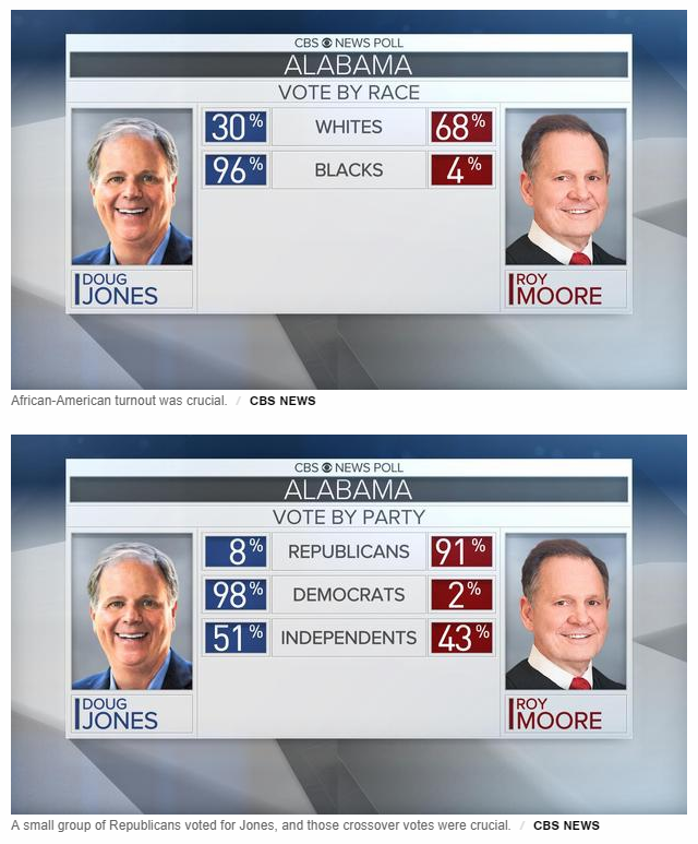 @stillCJ, I’ve looked at some of the exit polls and I don’t think the little girl thing made much of a difference. I just think Moore was an extremely polarizing candidate. He has strong support among very conservative, white evangelicals. And no support from anyone else. So less religious and moderate republicans simply weren’t going to show up for him. And he obviously drove every democrat crazy because they basically all showed up. The GOP in Alabama just needs to do a better job of weeding out loser candidates early on.