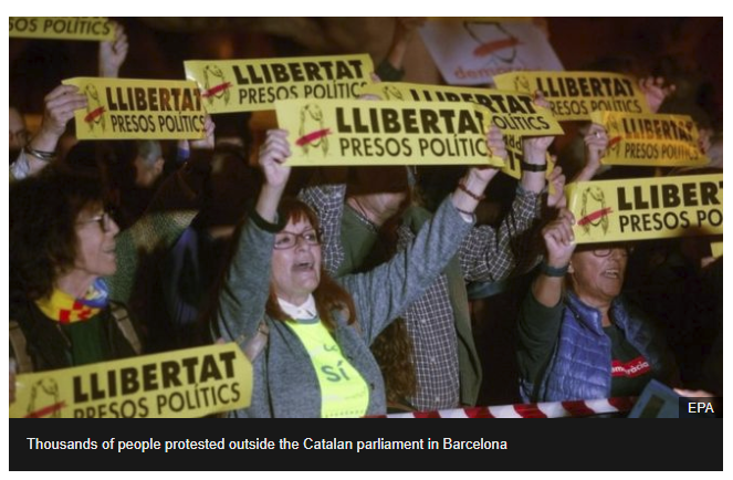 The actions of the Catalan separatists don’t make any sense to me. If they have declared independence then why do they subject themselves to the authority of a Spanish court? It seems that those 8 detained went to court to answer charges. That is explicit recognition of a Spanish court. If they believe they are truly independent then they should tell the Spanish court to go to hell and focus on building independent institutions. And if the Spanish national police show up to arrest them, the separatists would need to get their supporters to prevent such arrests.