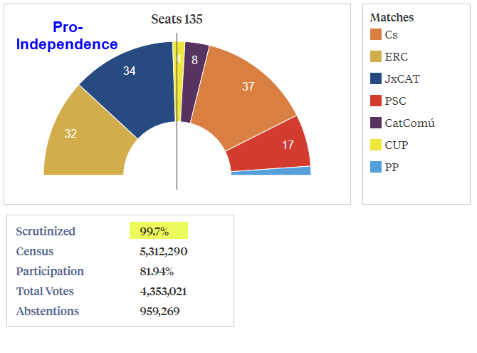 Let is also keep in view that the division of opinion seems very even, with pro-separation parties receiving only a minority of the vote, at c. 48 per cent., and having two fewer parliamentary seats than they won in 2015. (JxC 21.7%, ERC 21.4% and CUP 4.5%.) (Catalunya en Comú-Podem received 7.4% and has refused to position itself as being either pro or anti separation.) Just like the flawed referendum that led to this election, the outcome does not provide a firm basis for proceeding with separation of Catalonia from Spain.